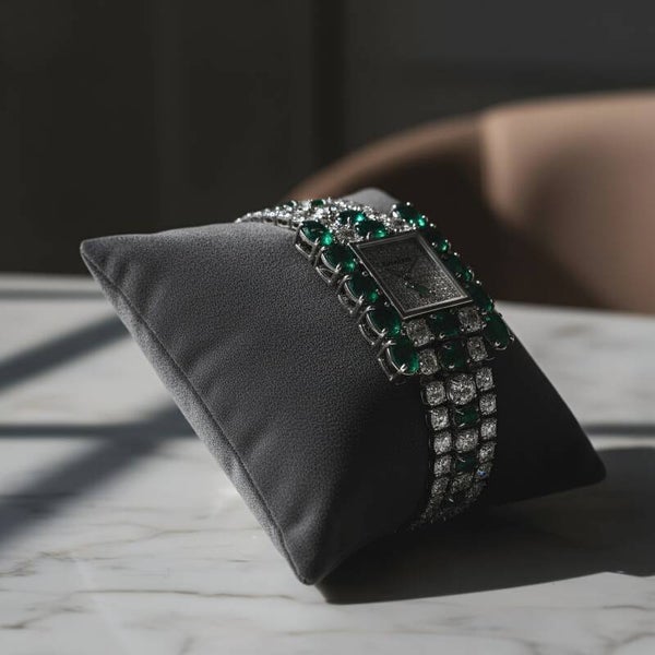 The Emerald Sovereign stands at the apex of haute-jewelry watchmaking — a masterpiece crafted for collectors who demand the extraordinary. This exceptional timepiece is adorned with hand-selected Zambian emeralds and premium white diamonds, each meticulously set to create a silhouette of pure opulence.
