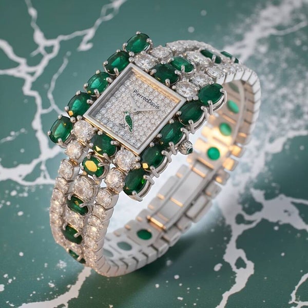 Its pavé-diamond dial features the signature PiérrecDavís falcon emblem, symbolizing precision, strength, and elevated artistry. The multi-row couture bracelet wraps the wrist with a fluid architecture of emerald brilliance and diamond fire, delivering a statement reserved for only the most discerning clients.